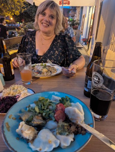 We walked roughly north to south, through the old town, past the Wawel Royal Castle and though the old Jewish quarter (Kazimierz), before catching a tram back to where we'd parked the Womo. We enjoyed a typical Polish meal: pierogi (ravioli) with a variety of fillings and stuffed Cabbage, washed down with dark beer: just what we needed after a hot day sightseeing!
